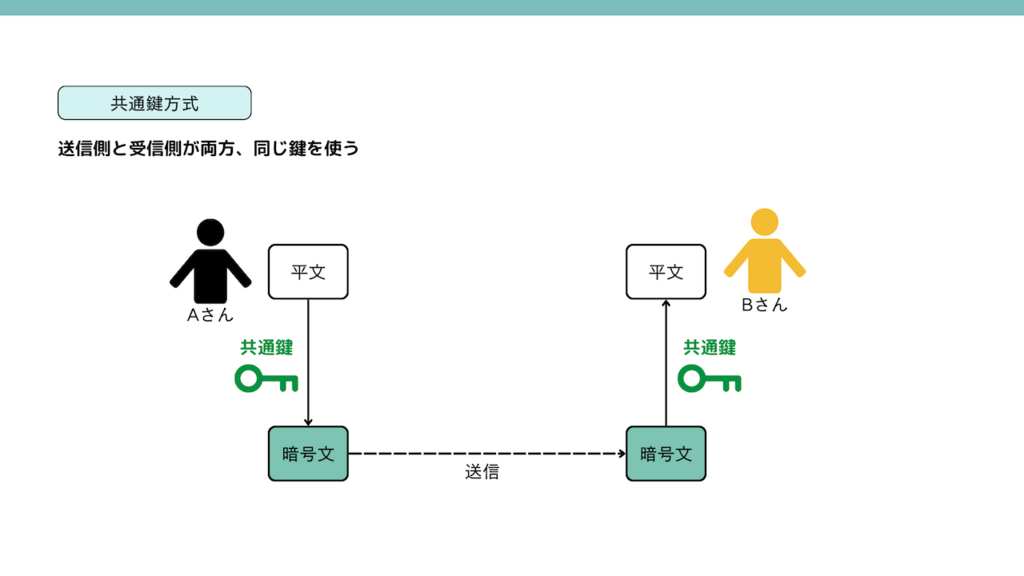 暗号化と復号に同じ鍵を使う場合、共通鍵暗号方式といいます。