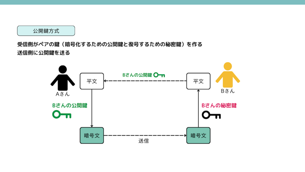 公開鍵は暗号化するための鍵で、復号のために使えません。復号するためには秘密鍵が必要です。そのため、Bさんは公開鍵をメールやHPで公開することができます。送信したいAさんはその公開鍵を使って送りたい平文を暗号化します。暗号化された暗号文をBさんに届きましたら、Bさんは自分が持っている秘密鍵を使って暗号文を復号できます。秘密鍵はBさんしかわかりませんので、情報は安全にAさんからBさんに渡ることができます。